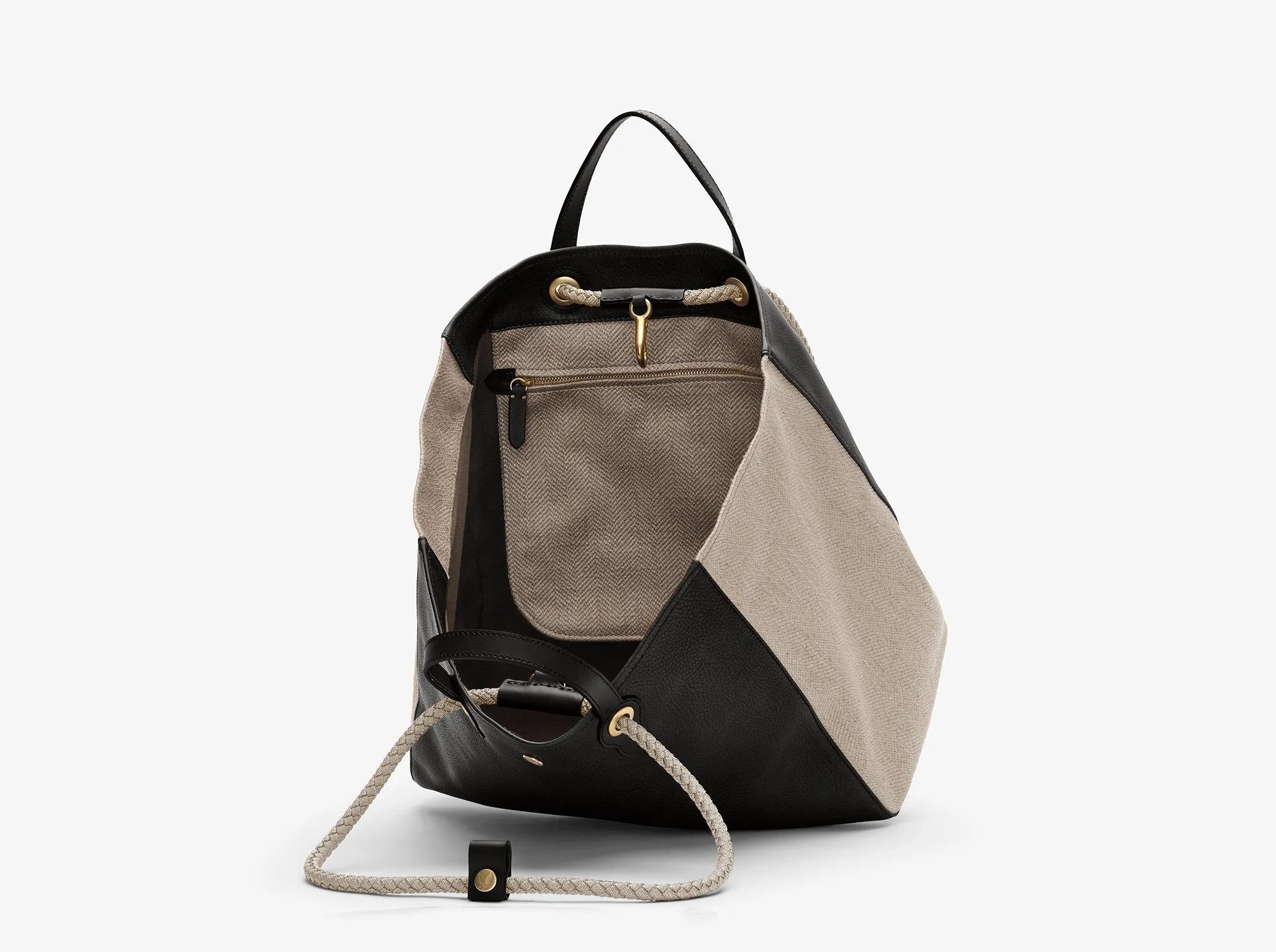 Features stitched, reinforced bridle leather handles for a firm grab while a tightly woven nylon string resembling traditional sailor rope running through two brass eyelets on the front handles and back acts as a long shoulder strap, offering an incorporated closure mechanism on the inside through the attachment of a D-ring and sailor hook. A hanging inside zipped pocket crafted in linen herringbone used in both gussets on the one side and two open slide-down pockets in cotton lining opposite ensures the necessary storage options while on the go.