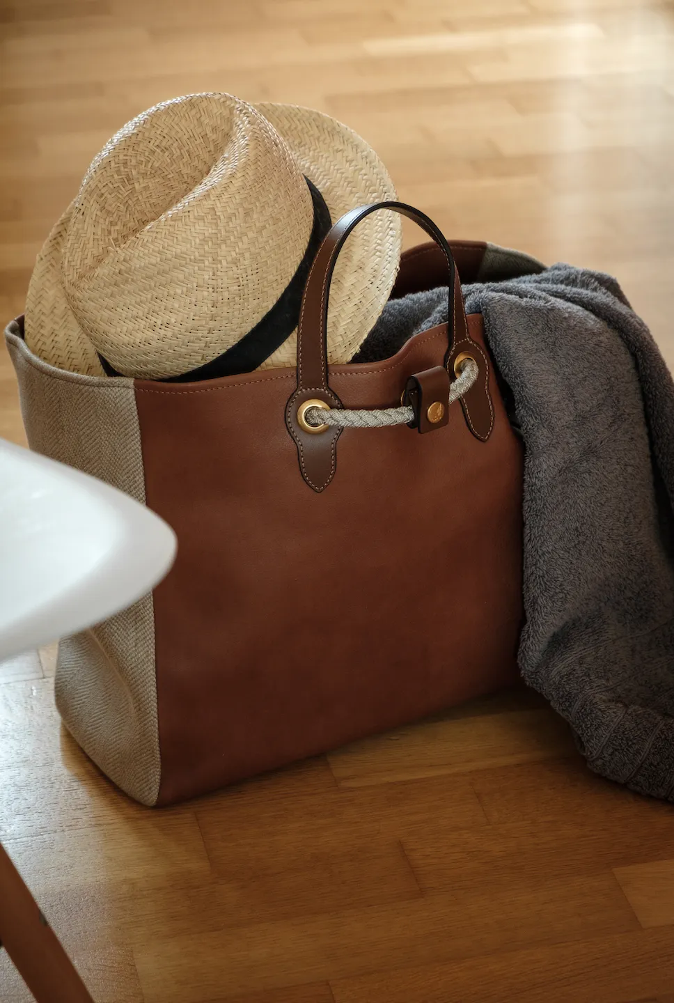 Shopping tote, work tote or transit tote. The Consort in the compelling combination of vegetable tanned structured leather, bridle leather and our�� linen herringbone fabric, combines precise detailing with amble space and optimal functionality for a tote bag that will seamlessly blend into most people's everyday life, however it sees you fit.